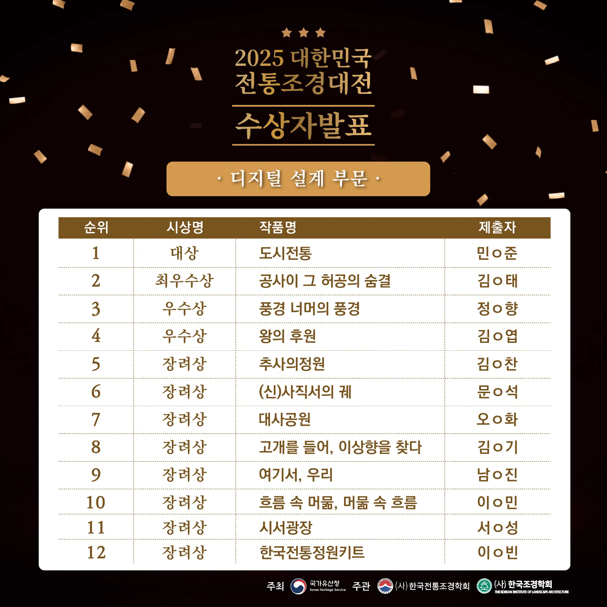 2025년 제 2회 대한민국 전통조경대전 『디지털 설계』부문 수상작은 다음과 같습니다.